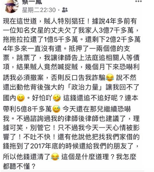 这就不得不让人觉得盛品儒蔡一凤的婚姻很幸福了。毕竟豪门的女人一般都不能插手老公的生意,日常只能负责家庭事务,组织派对照顾小孩子之类的。但是大家发现当盛品儒借给其他富商的钱收不回来的时候,是蔡一凤在网络上声讨。