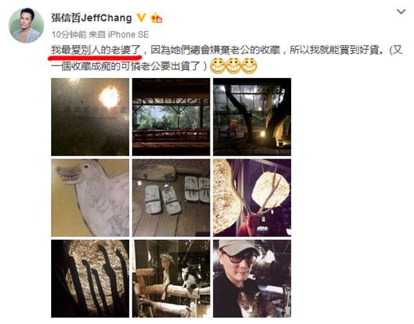 4月14日下午,张信哲发出一条微博:“我最爱別人的老婆了,因为她们总会嫌弃老公的收藏,所以我就能买到好货。(又一个收藏成痴的可怜老公要出货了)”。