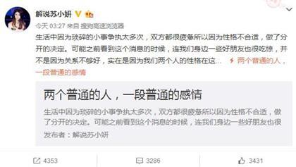 苏小妍博文中写到:“生活中因为琐碎的小事争执太多次,双方都很疲惫所以因为性格不合适,做了分开的决定。可能之前看到这个消息的时候,连我们身边一些好朋友也很吃惊,并不是因为关系不够好,实在是因为我们两个人的性格在这方面都比较低调不太喜欢和其他人谈论私人感情。”