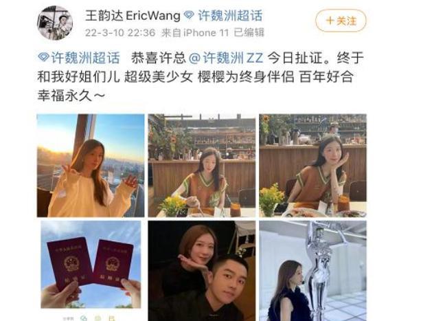 网友王韵达在许魏洲超话晒出照片,并送上祝福,“恭喜许总今日扯证,终于和我好姐们儿樱樱为终身伴侣”。据悉,许魏洲老婆名为张圣樱。