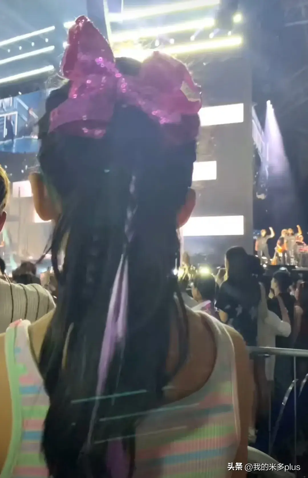 伊能静到了内场给女儿拍了背景照,小米粒头发上系了红色亮片蝴蝶结,马尾辫里面还加了彩带,伊能静不光把自己变美,还让女儿从小就很精致。