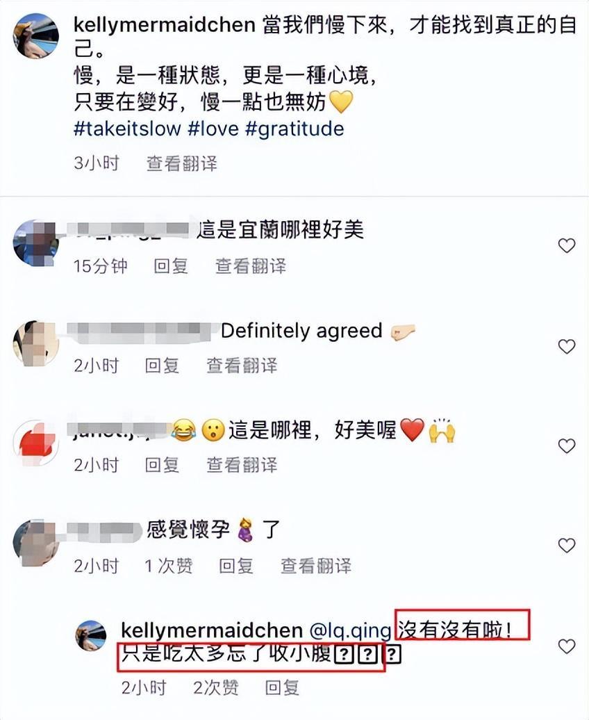 对于网友怀三胎评论,很快陈若仪本人也进行了回应,她表示:“没有没有啦”,一句“只是吃太多忘了收小腹”,不要太幽默。
