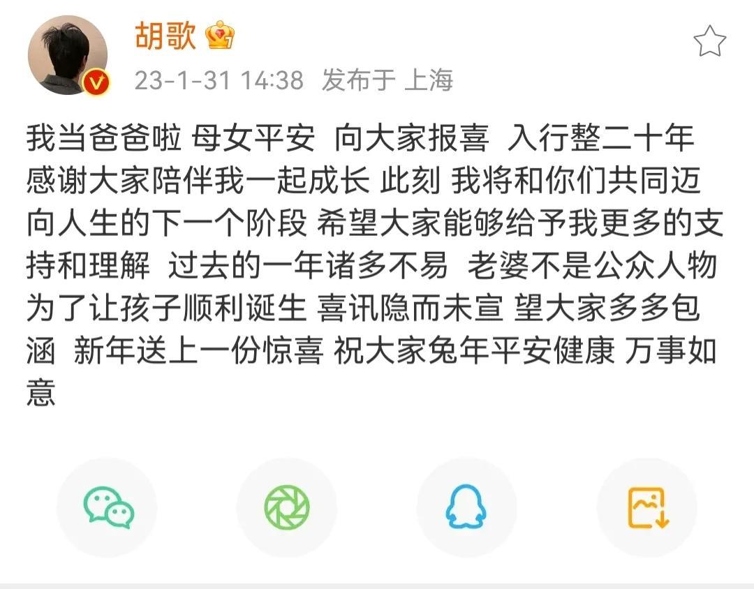这样看来真的挺理解胡歌之前为什么会一直谈地下恋情,结婚也不公开了,因为他刚官宣了自己结婚有孩子的消息,另一半就被扒得干干净净,网友们还对他的另一半指指点点。