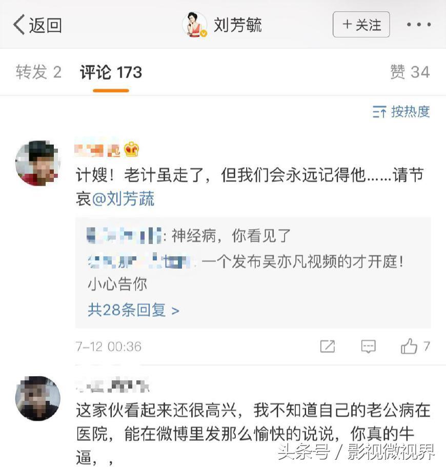 不过,在大家悼念计春华的时候,也有很多不一样的声音。有些网友跑到《还珠格格》里彩霞的扮演者刘芳毓的微博下悼念计春华,甚至还有网友谩骂刘芳毓,说她老公病在医院怎么还能发那么愉快的说说。