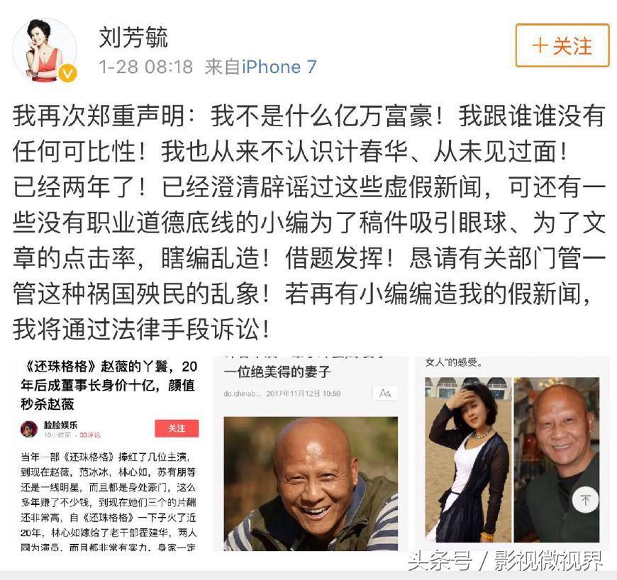对于这些无中生有的谣言,刘芳毓曾经多次澄清,还特地发了微博说她不是计春华的老婆,她从来不认识计春华,而且两人也没有见过面,他们俩的传言只是一些没有职业道德底线的小编为了稿件吸引眼球、为了文章点击率而瞎编乱造的。