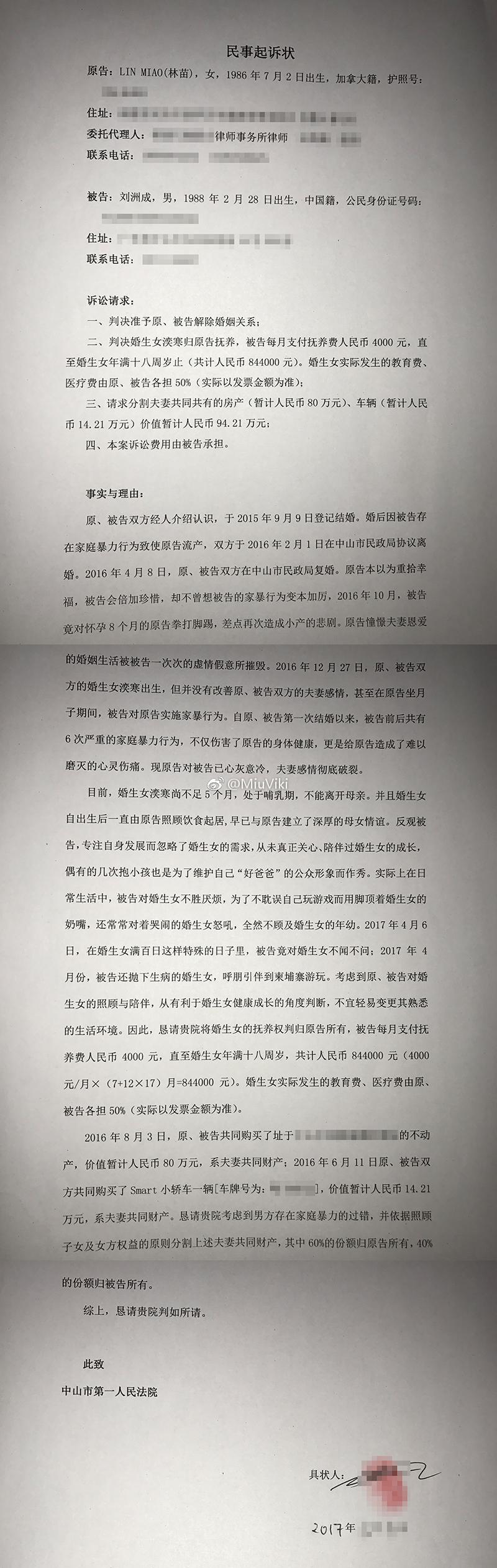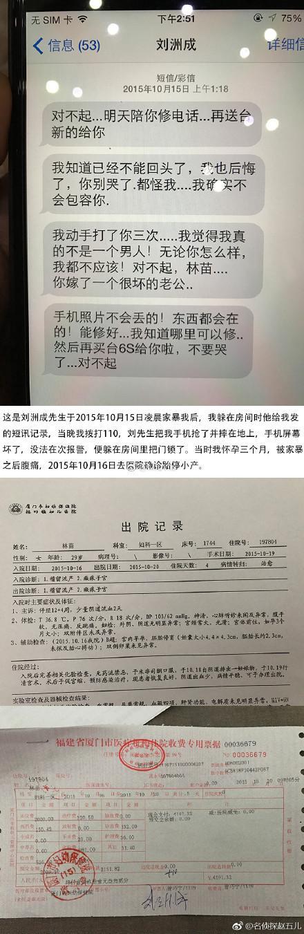 林苗在声明中说到,15年10月,刘洲成对怀孕3个月的她实施家暴,导致其腹痛,然后小产。