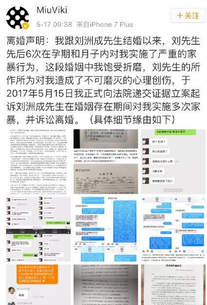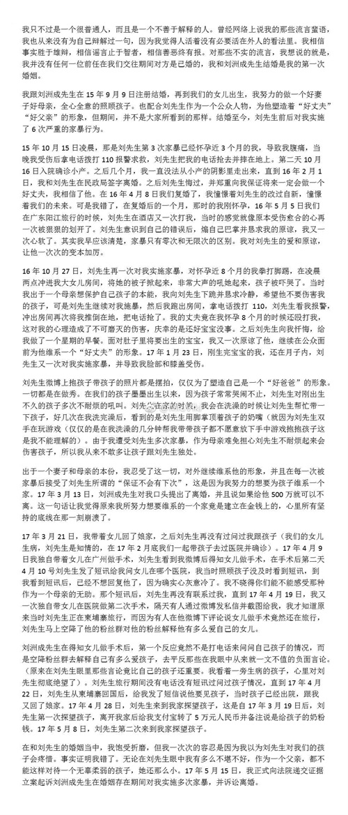 5月17日,刘洲成妻子在微博发布离婚声明,她称:“我跟刘洲成先生结婚以来,刘先生先后6次在孕期和月子内对我实施了严重的家暴行为,这段婚姻中我饱受折磨,刘先生的所作所为对我造成了不可磨灭的心理创伤,于2017年5月15日我正式向法院递交证据立案起诉刘洲成先生在婚姻存在期间对我实施多次家暴,并诉讼离婚。”