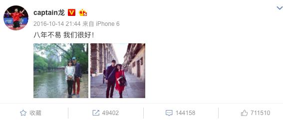 17年12月,马龙手机屏保出现了一家三口牵手照,让人忍不住猜测马龙是否已经升级当爸爸。而在此消息曝光后,马龙在微博公开承认自己当爸的喜讯,并晒出了一家三口牵手照片,并写道:“你好,兄弟”,国乒队好友纷纷前来祝贺,调侃马龙闷声办大事。