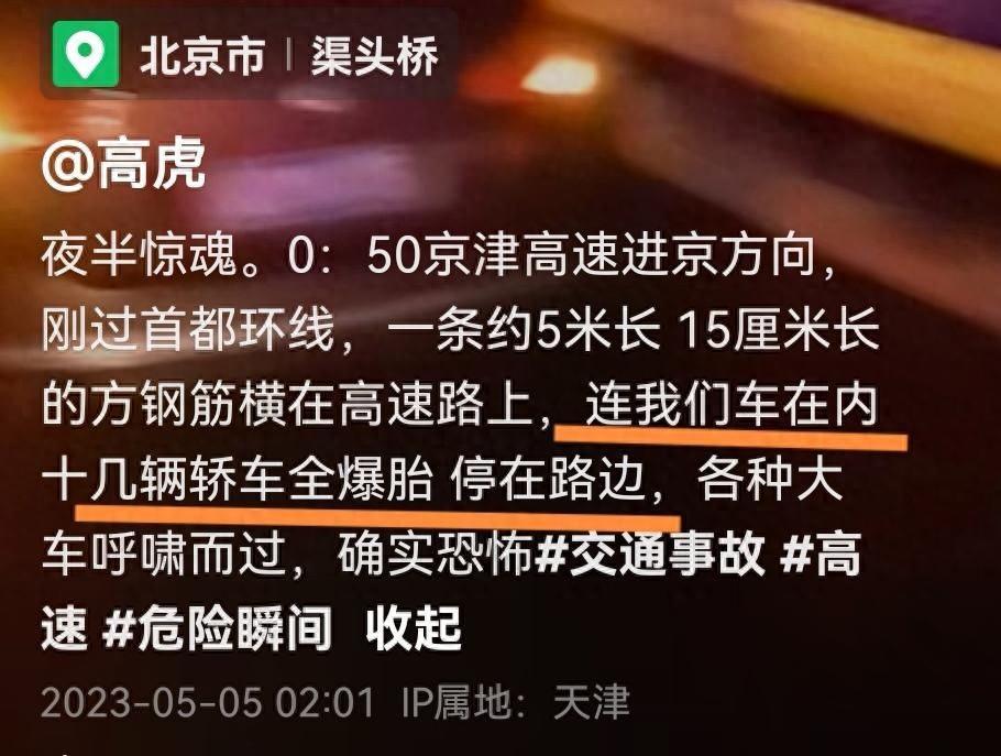 5月5日凌晨两点,演员高虎发文表示在高速路上出事故,导致自己在内的十几辆车全部爆胎,只因有一根钢筋横在高速路上,高虎文中自称“我们”,显然车上并不是只有高虎一人,还好人没有事。