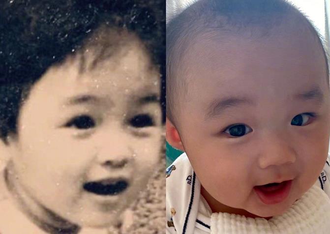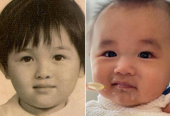 除此之外,古巨基还晒出了两张老婆小时候和儿子的对比照片。