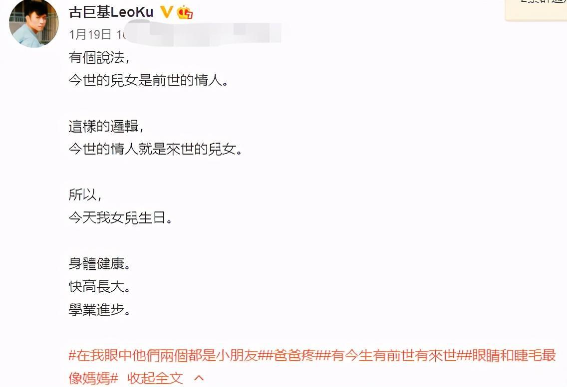 古巨基表示曾经有个说法,今世的儿女是前世的情人,这样的逻辑,今世的情人就是来世的儿女,所以今天是她女儿生日,祝她身体健康、快点长大、学业进步。