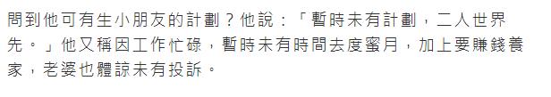 不过,他也表示因为工作繁忙,要赚钱养家,他和老婆还没有时间去度蜜月,好在老婆非常理解他。