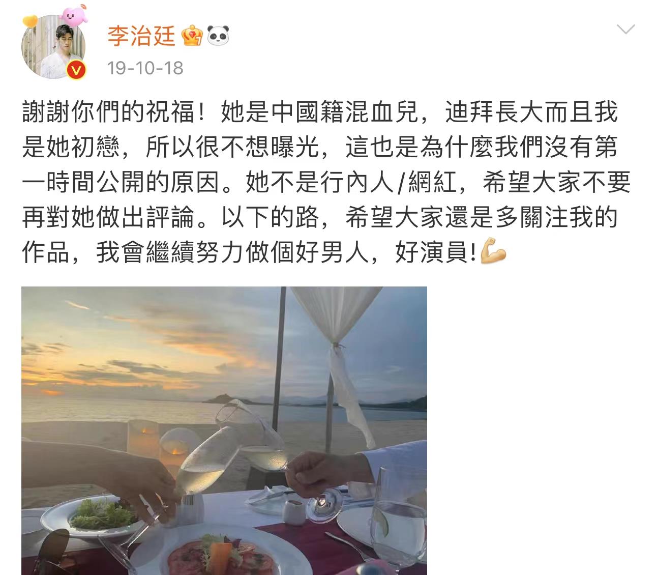 当时,李治廷透露,女友是在迪拜长大的,自己是对方的初恋,所以他格外保护女友,希望大家不要对她做任何评价。