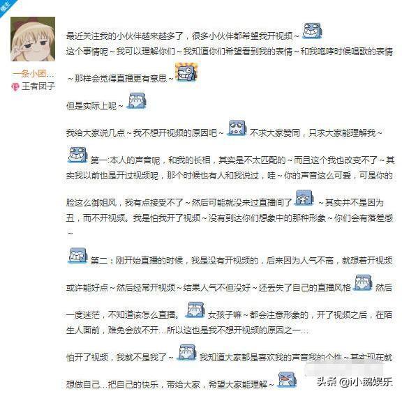 “一条小团团OvO”在之前对于自己不开视频直播也是做了一个解释,许多粉丝也是希望“一条小团团OvO”能在直播的时候开启视频。对于这个问题“一条小团团OvO”讲述自己不开视频的原因,一方面是由于自己的声音和自己“御姐范儿”的长相十分不协调,另一方面自己在开始直播的时候开了视频直播效果不好,也和自己的直播风格有些突兀。
