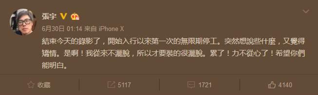 前几天,张宇突然发微博称自己将会无限期停工,很多网友表示累了就休息,我们会一直等你回来。