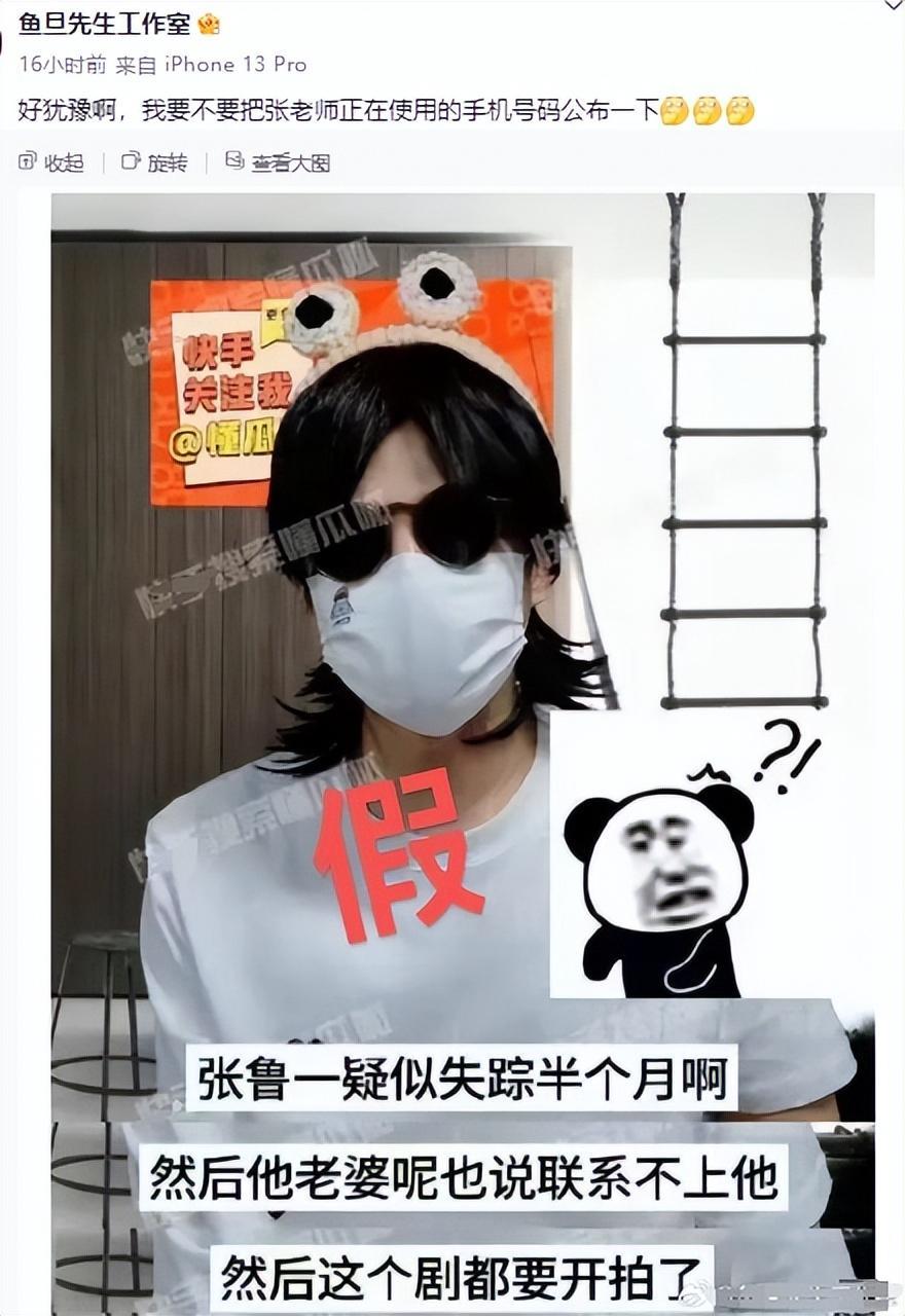 工作室在“狗仔爆料张鲁一失踪半个月”的图片上盖上了一个“假”字印章,然后,幽默地说,好犹豫啊,要不要把张老师正在使用的手机号公布一下。
