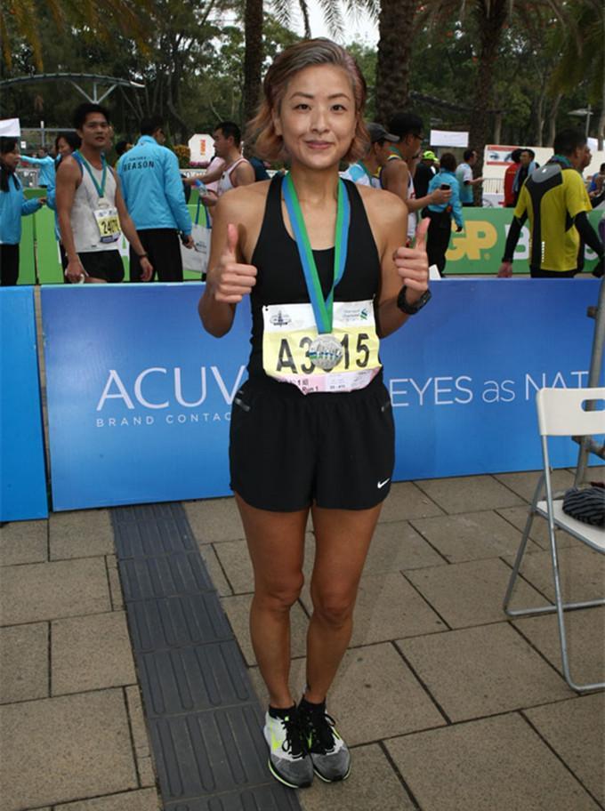 酷爱跑步的她,还特意抽时间参加了每年举办的马拉松比赛,而且不止一场。最好的一次成绩,是在2014年。当时,她以3小时52分完成全马赛事,成功打破好友陈冠希的记录,被称为“最能跑的明星”。