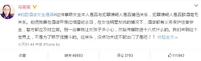马薇薇表示,这件事跟女生本人是否与犯罪嫌疑人是否情侣关系,犯罪嫌疑人是否醉酒毫无关系。他俩就算在酒店开房过结婚纪念日,在女性明显反抗的情况下,酒店都有义务保护住客安全,警方都应及时立案。别一出事就让女孩子多小心,然后传播防狼十八式什么的。我们来到这个世界上,不是为了跟歹徒搏 ...