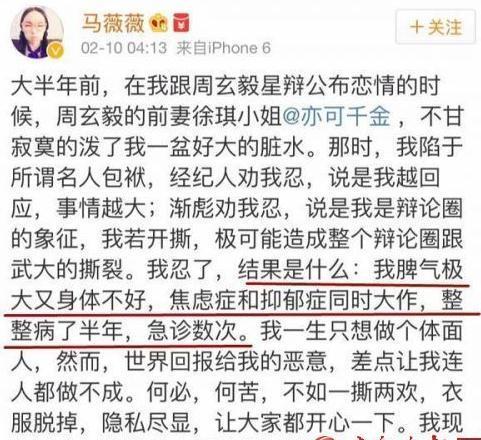 周玄毅前妻徐琪也因此炮轰过马薇薇,在网上发了一段声明,直指马薇薇系小三。不过周玄毅前妻徐琪已经清空了自己的微博,所以这张声明是网上流传的图片。徐琪想表达的意思,简而言之一句话:虽然徐琪嘴上说马薇薇没有影响她和周玄毅的婚姻,但是言语间却透露了造成离婚的正是马薇薇。