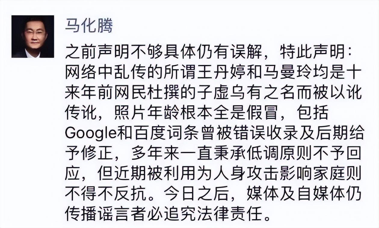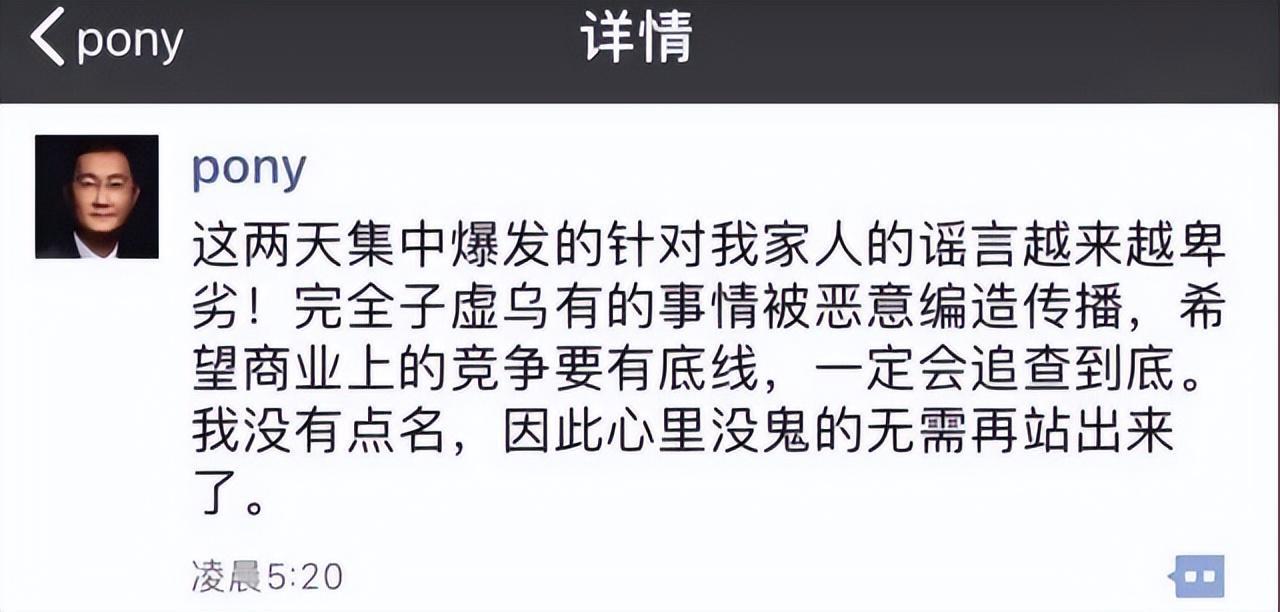 过了一段时间,似乎又有谣言传出,马化腾再次发圈辟谣,将追究传播谣言的媒体及自媒体者的法律责任。
