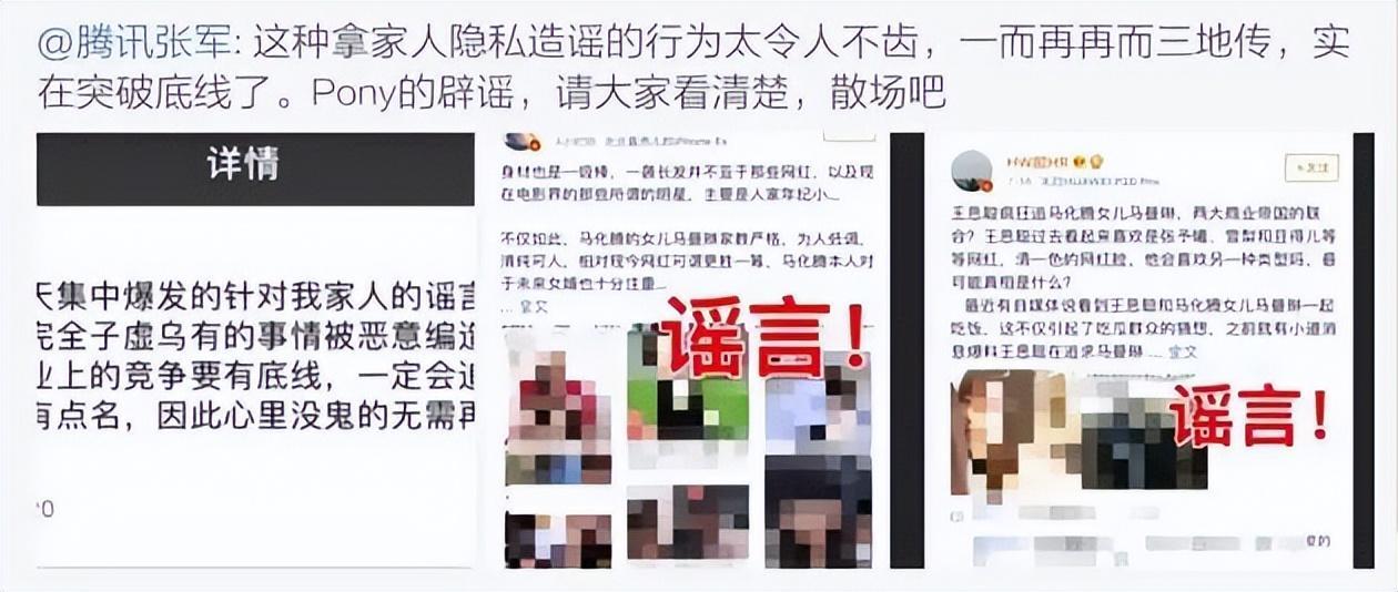 腾讯公司的公关总监张军,也在微博证实了马化腾的回应,称“拿人家家人的隐私造谣的行为令人不齿,实在突破底线了。Pony的辟谣,请大家看清楚,都散场吧”。自此,网上再也见不到关于马化腾的家人的谣言传出。
