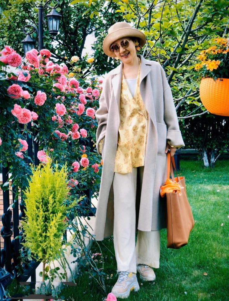 范明的老婆叫厉玲,二婚嫁范明,一直被宠爱,已经是奶奶的厉玲,穿衣气质像个小姑娘,她的衣服颜色素气,用小面积亮色点亮,素色的大衣搭配同色长裤,用暗黄色衬衫做内衬,整个look色彩亮了不少,里面还穿了件外套同色打底衫无比高级,层次感太好了,长款外套敞开穿气势十足,即使步入老年依旧是总裁范儿!