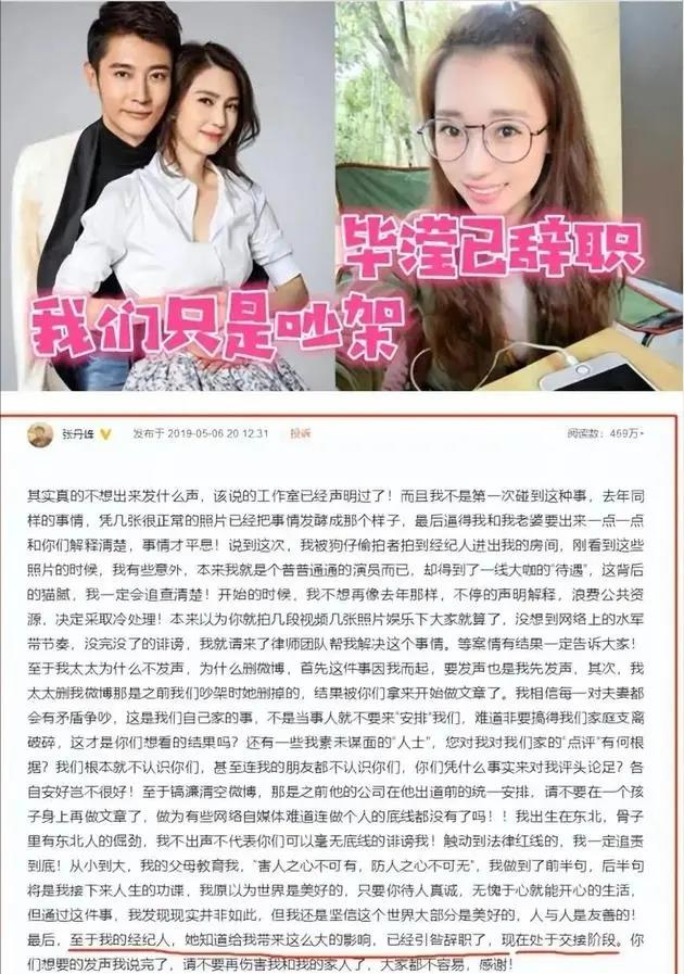 时间一长,绯闻极大地影响了张丹峰的形象,2019年5月,他不得不长文与毕滢划清界限,并透露对方引咎辞职。