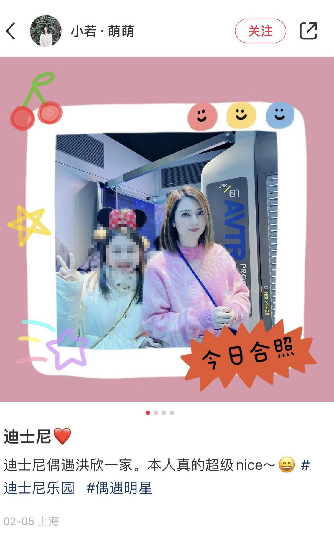 2月5日,有网友在上海迪士尼偶遇洪欣,她跟张丹峰带女儿去玩。