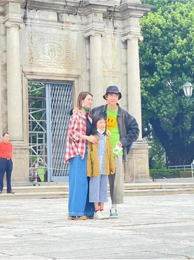 张丹峰背着大包包,负责照顾妻女,洪欣可能是走热了,将白色大衣系在腰间,十分随意。