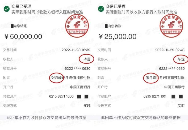 2022年11月,毕滢以小名“萌萌”帮张丹峰对接工作,商家的酬劳直接打到毕滢账户。