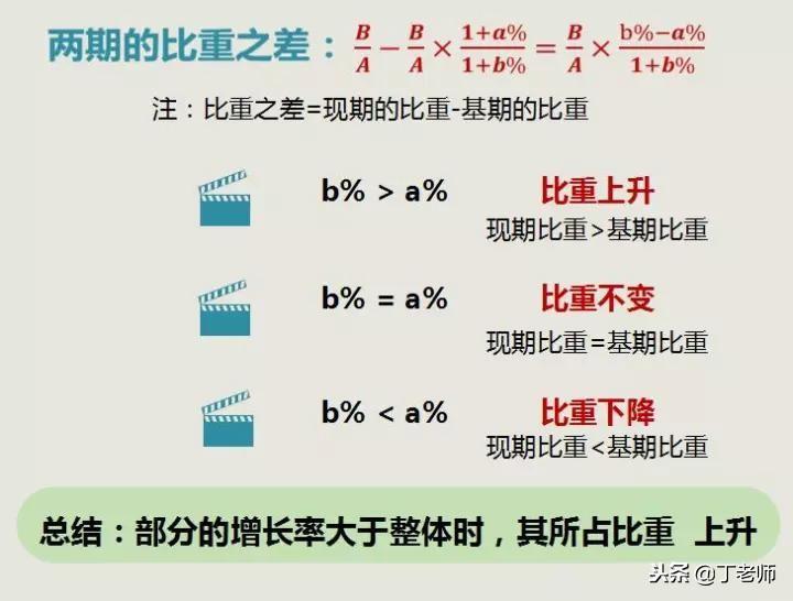比重的差,即两个百分数的差,一般用“相差x个百分点”表示。如本期比重比上期比重上升了3个百分点,表示“本期比重-上期比重=3%”。