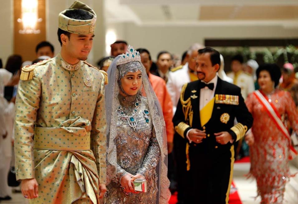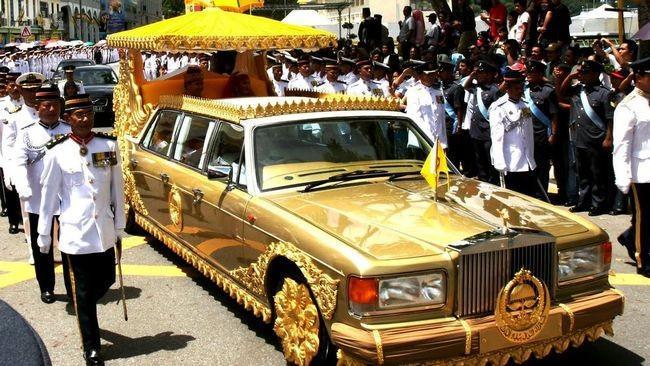 第一个儿子也就是文莱的王储大婚,哈桑纳尔的黄金有了大肆显摆的机会。接新娘的婚车劳斯莱斯镶满了黄金,宾客们使用的餐具全部纯金打造。
