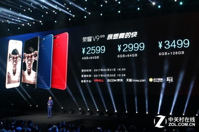 荣耀V9标准版:4GB RAM + 64GB ROM,售价2599元;