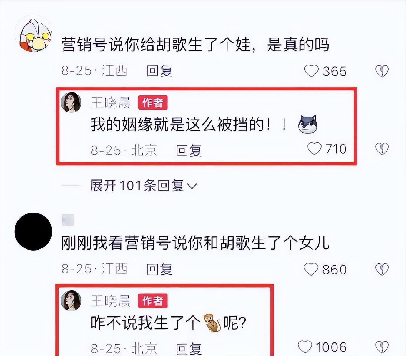 直到这时,网友们才相信胡歌孩子的妈并不是王晓晨,同时王晓晨也在微博回复了那些还在传绯闻的网友:“咋不说我生了个猴子呢?”