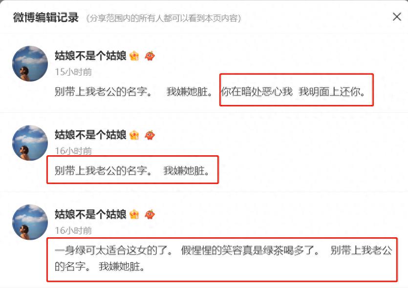 第一条文案写道“一身绿衣太适合这女的了,假惺惺的笑容真是绿茶喝多了,别带上我老公的名字,我嫌她脏!”