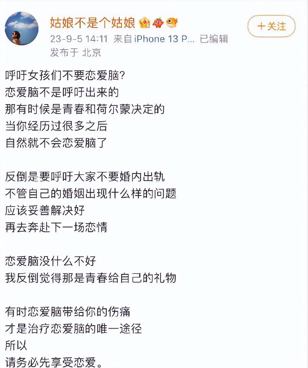 齐溪为宣传新片,呼吁女孩们不要“恋爱脑”,张婉婷转身就发了一篇文章,说没必要呼吁女孩不要恋爱脑,反倒应该呼吁大家不要婚内出轨。