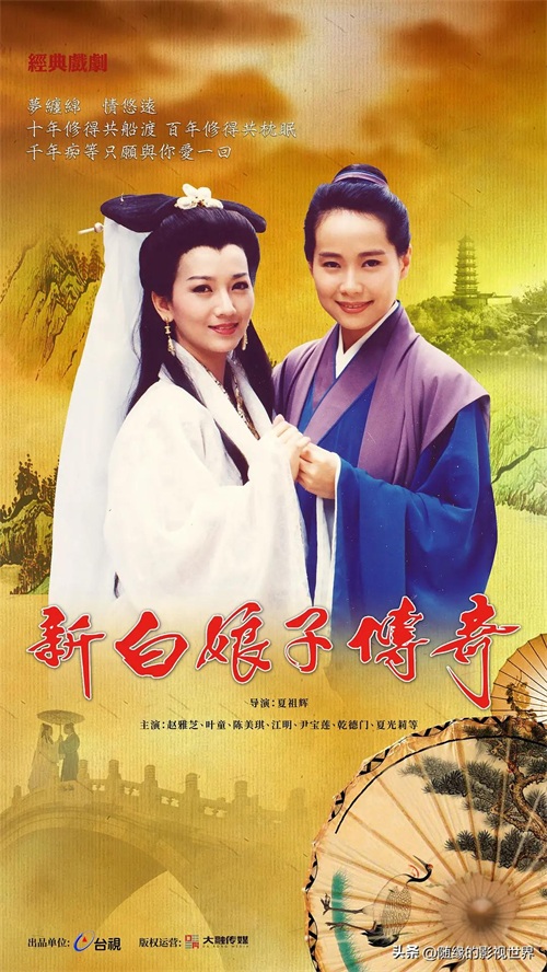 评价:1992年版的《新白娘子传奇》由赵雅芝和叶童主演,被认为是无法逾越的经典版本。该剧在台湾首播时收视率高达30%,并在1993年被央视引进到内地,位居央视历史收视排行榜第四名。2004年,该剧在CCTV-1和CCTV-8重播,夺得两个频道的年度收视冠军。该剧的导演夏祖辉是著名的黄梅调大师,开创了电视剧插入黄梅调唱段的先河。主题曲《千年等一回》和插曲《渡情》《青城山下白素贞》《纠缠》等,旋律优美,唱词富有古典戏曲韵味,深受观众喜爱。