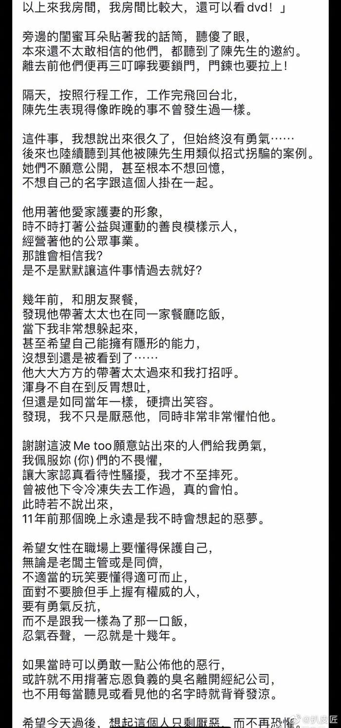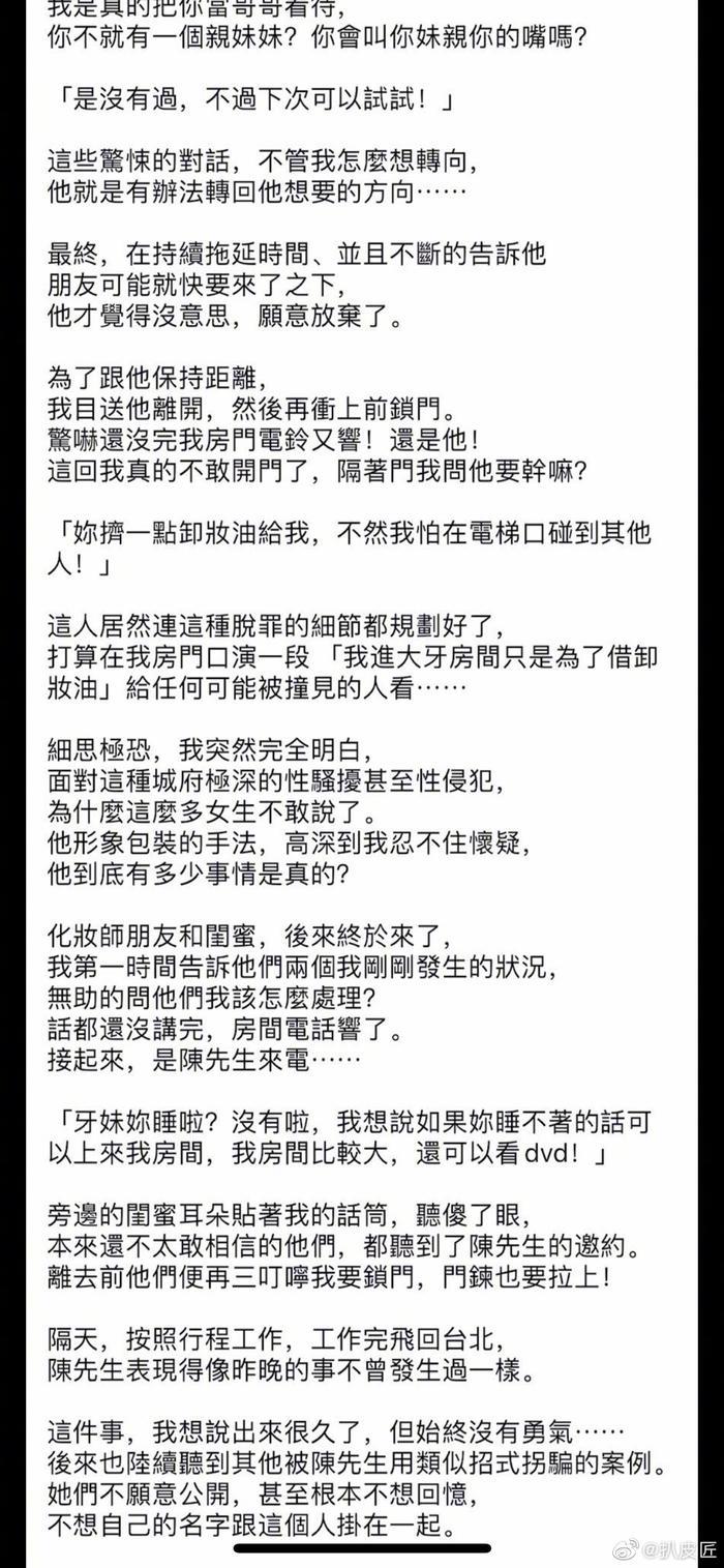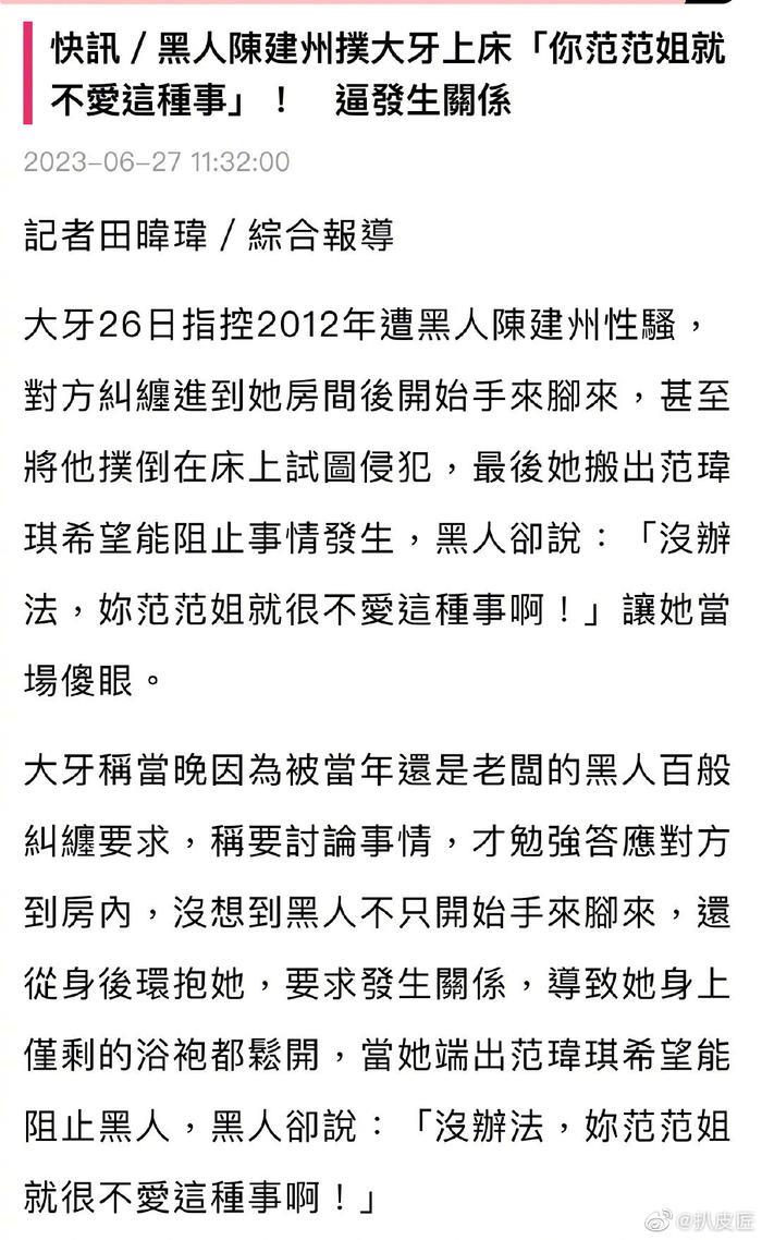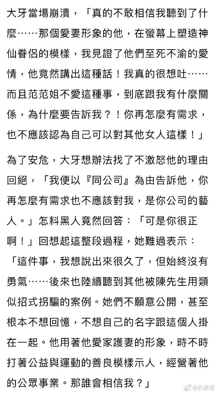 #陈建州被指控性骚扰# 陈建州爱妻人设崩塌?!黑涩会美眉大牙发文控诉陈建州性骚扰。那个时候陈建州和范玮琪已经结婚了,陈建州还对大牙说:“没办法,你范范姐很不爱这种事………”大牙表示希望今天过后,想起这个人只剩厌恶,而不再恐惧