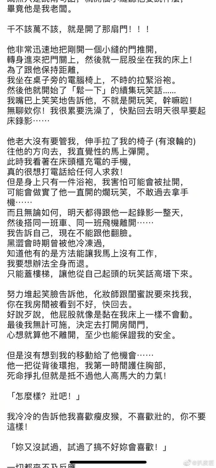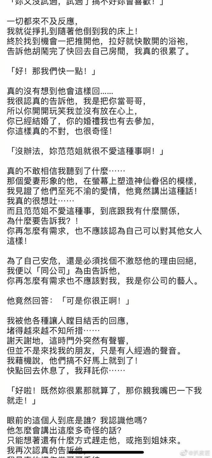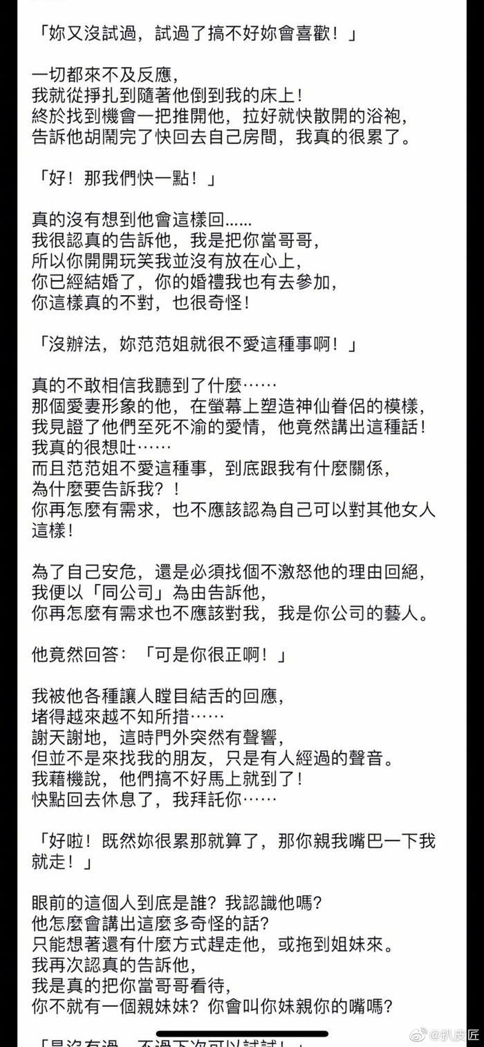 #陈建州被指控性骚扰# 陈建州爱妻人设崩塌?!黑涩会美眉大牙发文控诉陈建州性骚扰。那个时候陈建州和范玮琪已经结婚了,陈建州还对大牙说:“没办法,你范范姐很不爱这种事………”大牙表示希望今天过后,想起这个人只剩厌恶,而不再恐惧