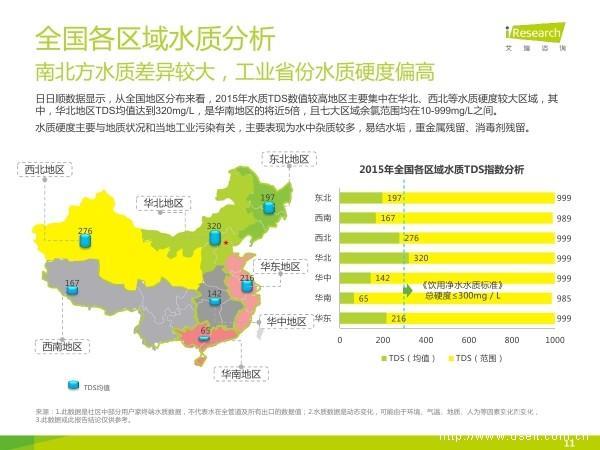 需要特殊说明的是下图中的指标为TDS值,与水质硬度有性质上的差异。但调查分析中,主要测量目标为地质水。其中离子成分主要为钙镁离子,所以在下图中TDS值一定程度上能代表水质的硬度。
