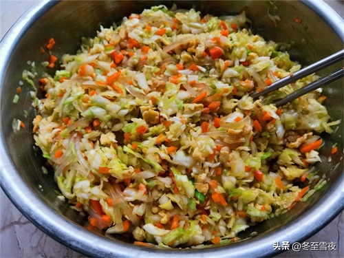 【包菜鸡蛋粉条馅包子】所需材料:包菜1棵、鸡蛋3个、粉条1把、油盐适量、大葱1棵、蚝油1汤匙、生抽2汤匙、花椒粉1茶匙、十三香1茶匙、