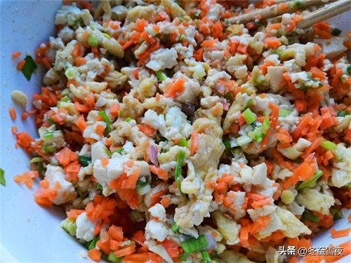 【豆腐馅包子】所需材料:北豆腐1块、鸡蛋4个、胡萝卜1根、蒜苗1把、油盐适量、葱1段、姜1块、蚝油1汤匙、十三香1茶匙、