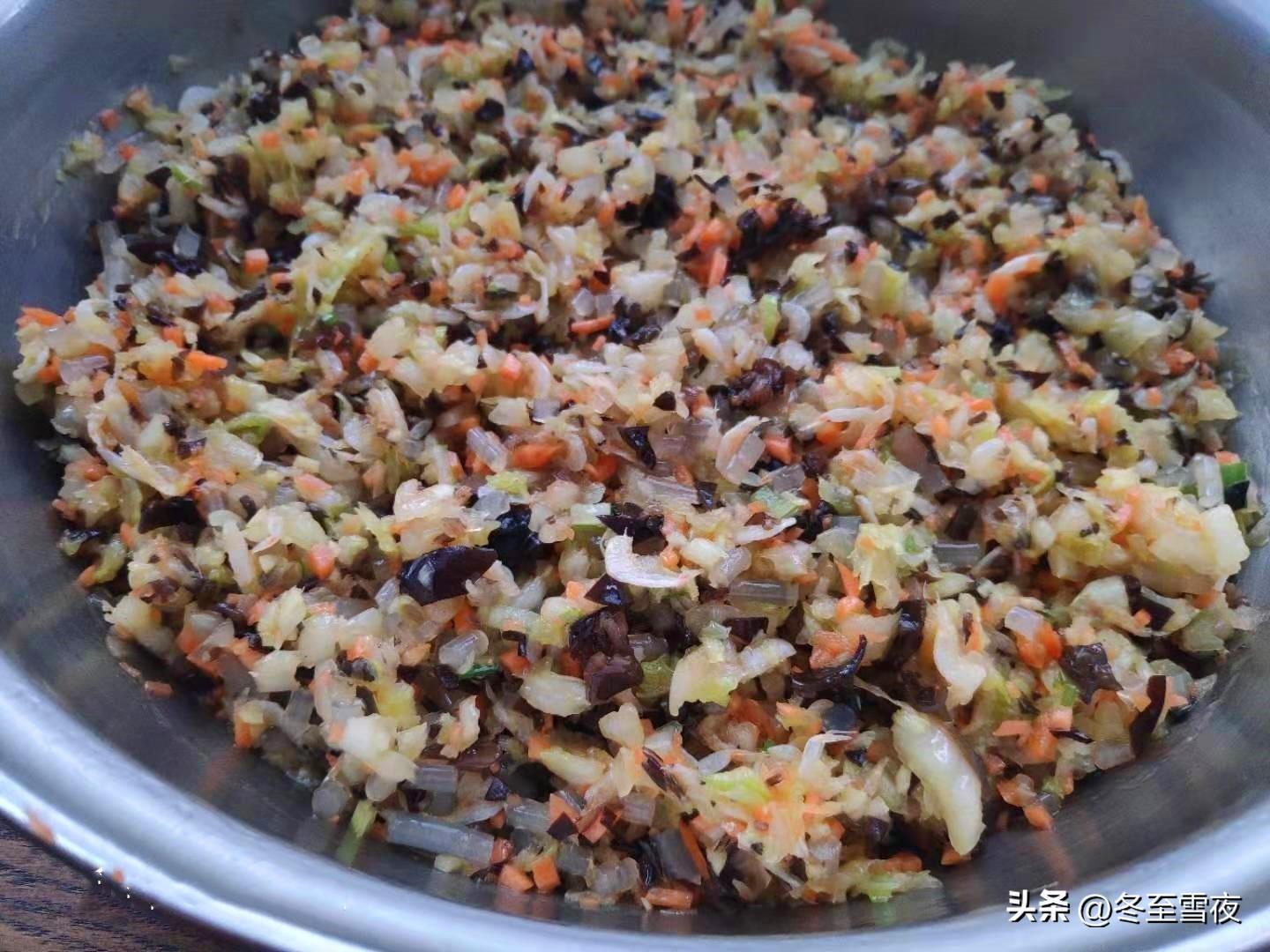 【什锦素馅包子】所需材料:白菜半棵、胡萝卜1根、粉条1把、水发木耳1碗、虾皮2汤匙、油盐适量、葱1段、姜1块、花椒20粒左右、蚝油1汤匙、生抽2汤匙、十三香1茶匙、