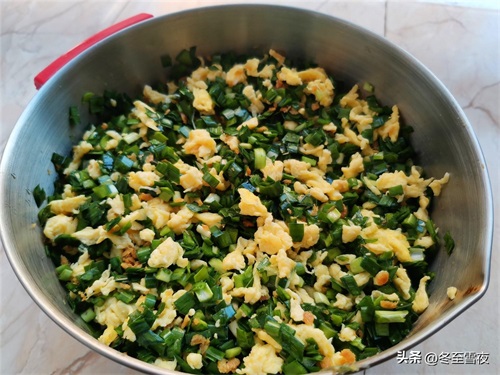 【韭菜鸡蛋馅包子】所需材料:韭菜1.5斤、鸡蛋5个、虾皮适量、豆油、盐适量、