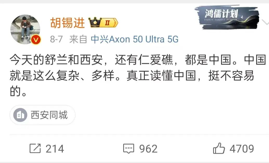 8月7日,老胡的另一条微博又引发了热议:“今天的舒兰和西安,还有仁爱礁,都是中国。中国就是这么复杂、多样。真正读懂中国,挺不容易的。”