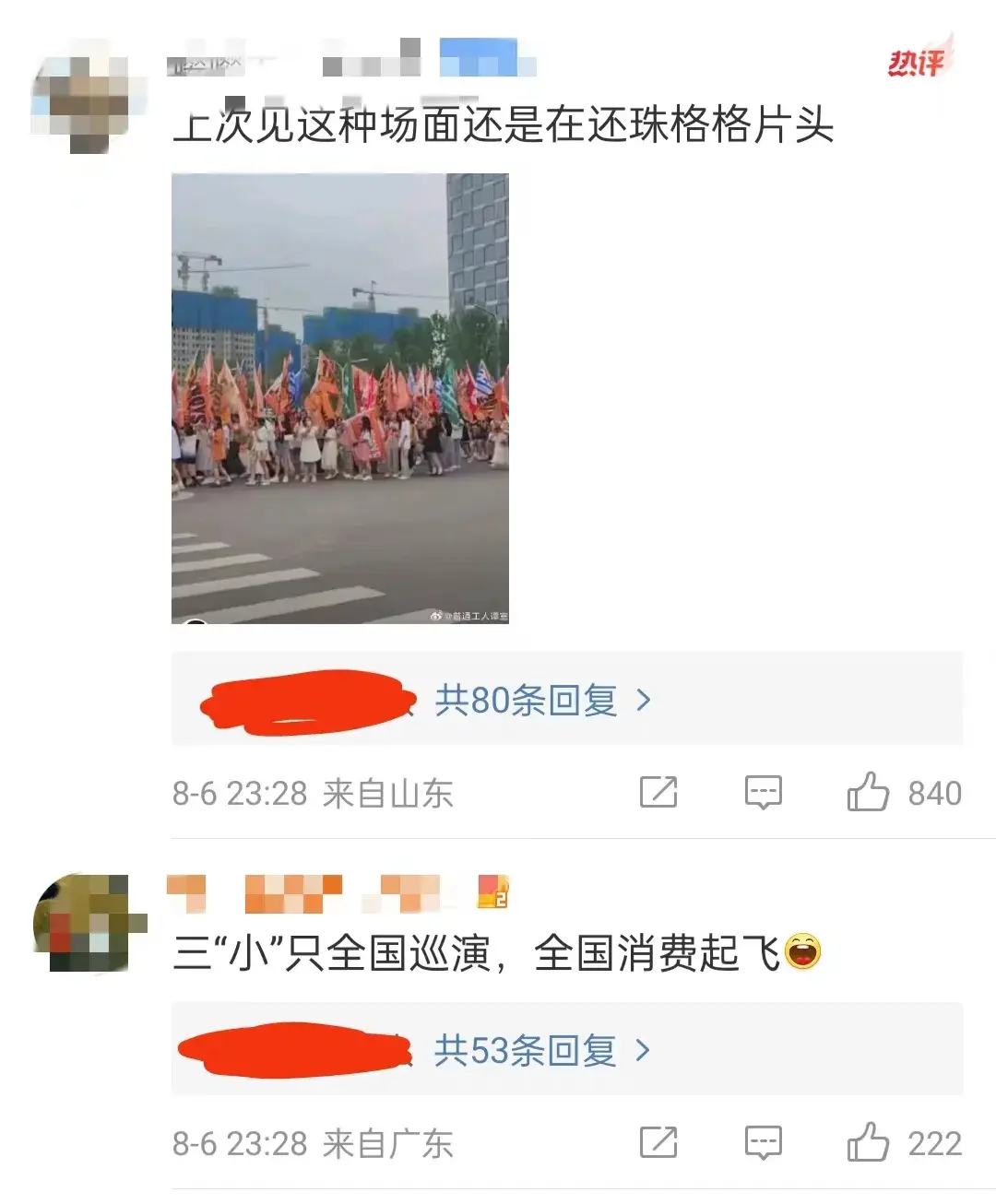 有网友在老胡的微博评论说:“三小只全国巡演,全国消费起飞。”也有网友说:“当年西安事变都没有这么热闹。”还有网友质疑:“这种追星消费能推动什么高质量发展。”