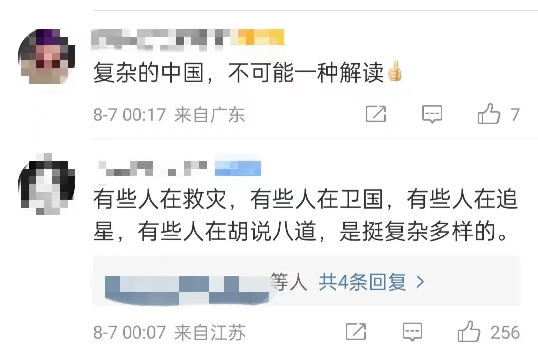 一句复杂多样的中国,“有人在默默救灾,有人在英勇卫国,有人在狂热追星”。有网友说“这是颓废的一代”,当然也有网友说“要包容,谁还没有个爱好”。