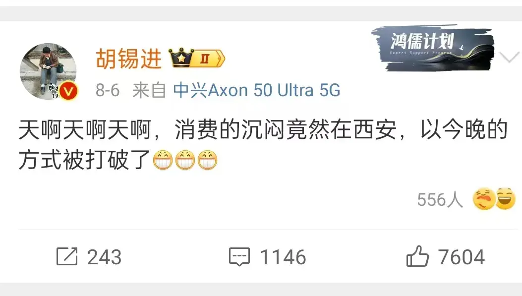 这一下子让全国网友好奇,古城西安发生了什么,竟然都能带动消费,引的老胡一连三个惊叹。