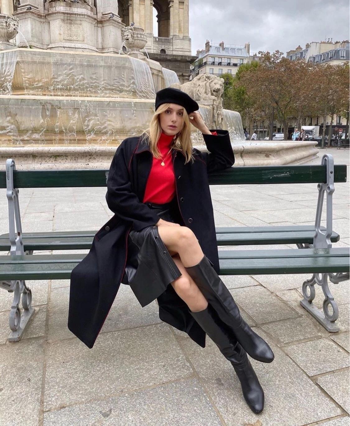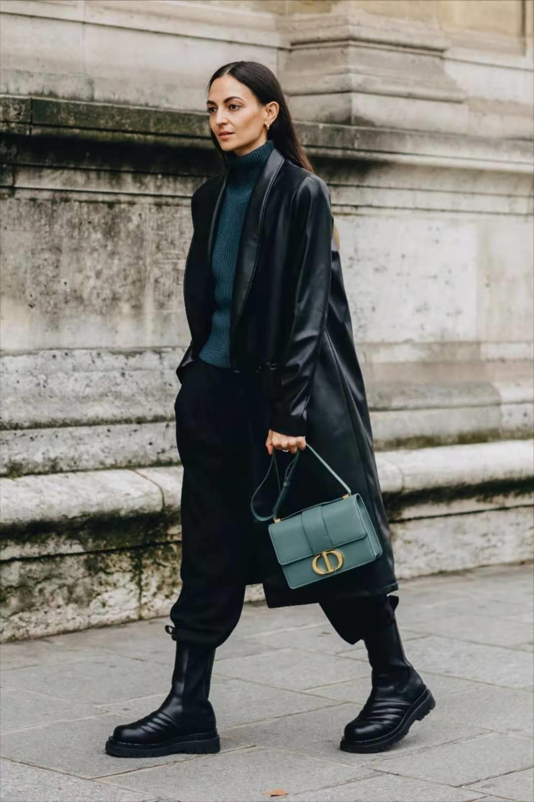 超火的三木博主就非常喜欢上衣和鞋子"同色"的穿搭,可以让整体的造型看起来既高级简约又十分的耐看。用黑色来做衣鞋同色是最简单也是最不容易出错的,而且黑色还是很显瘦的一种颜色,黑色大衣+黑色长靴很有质感。