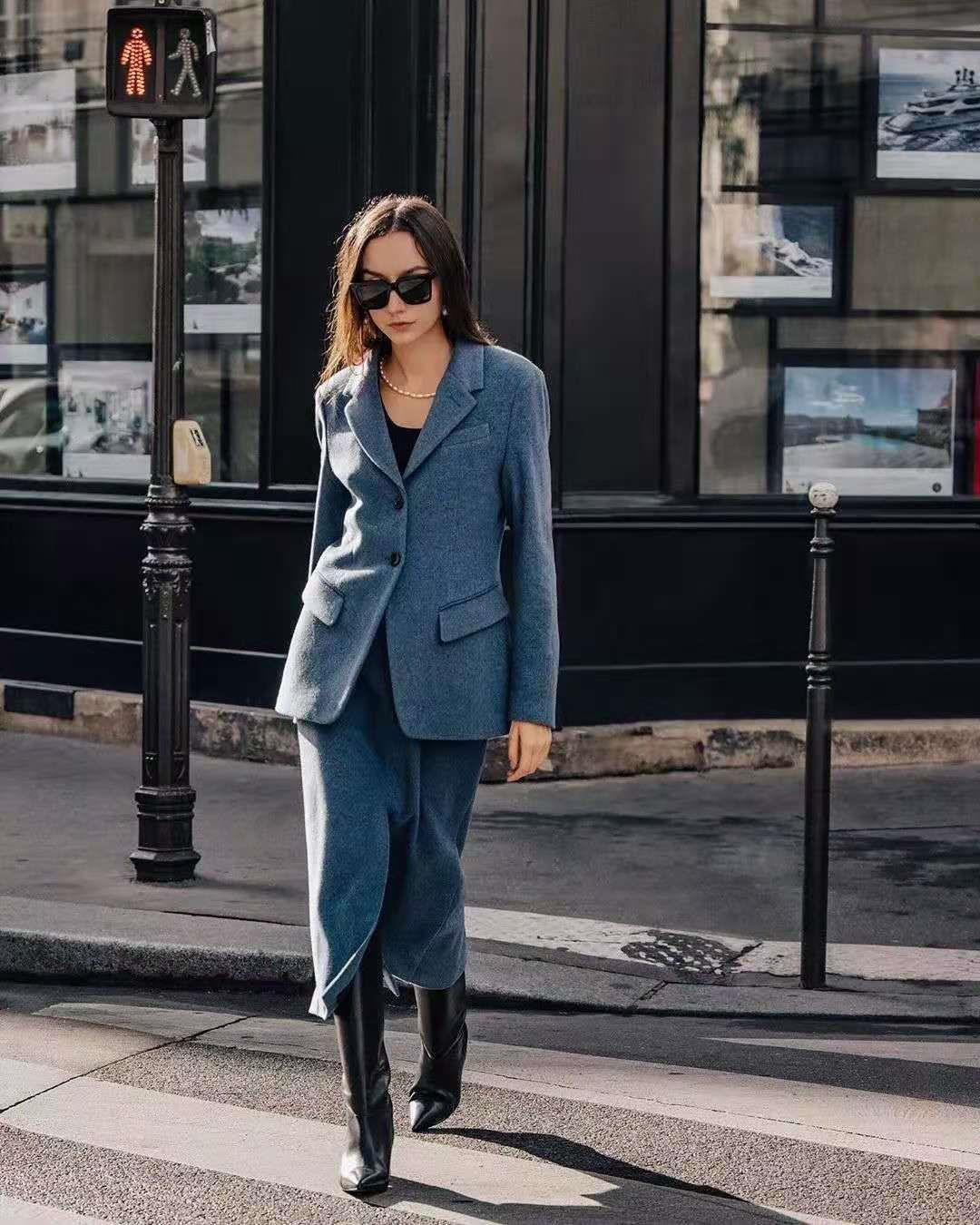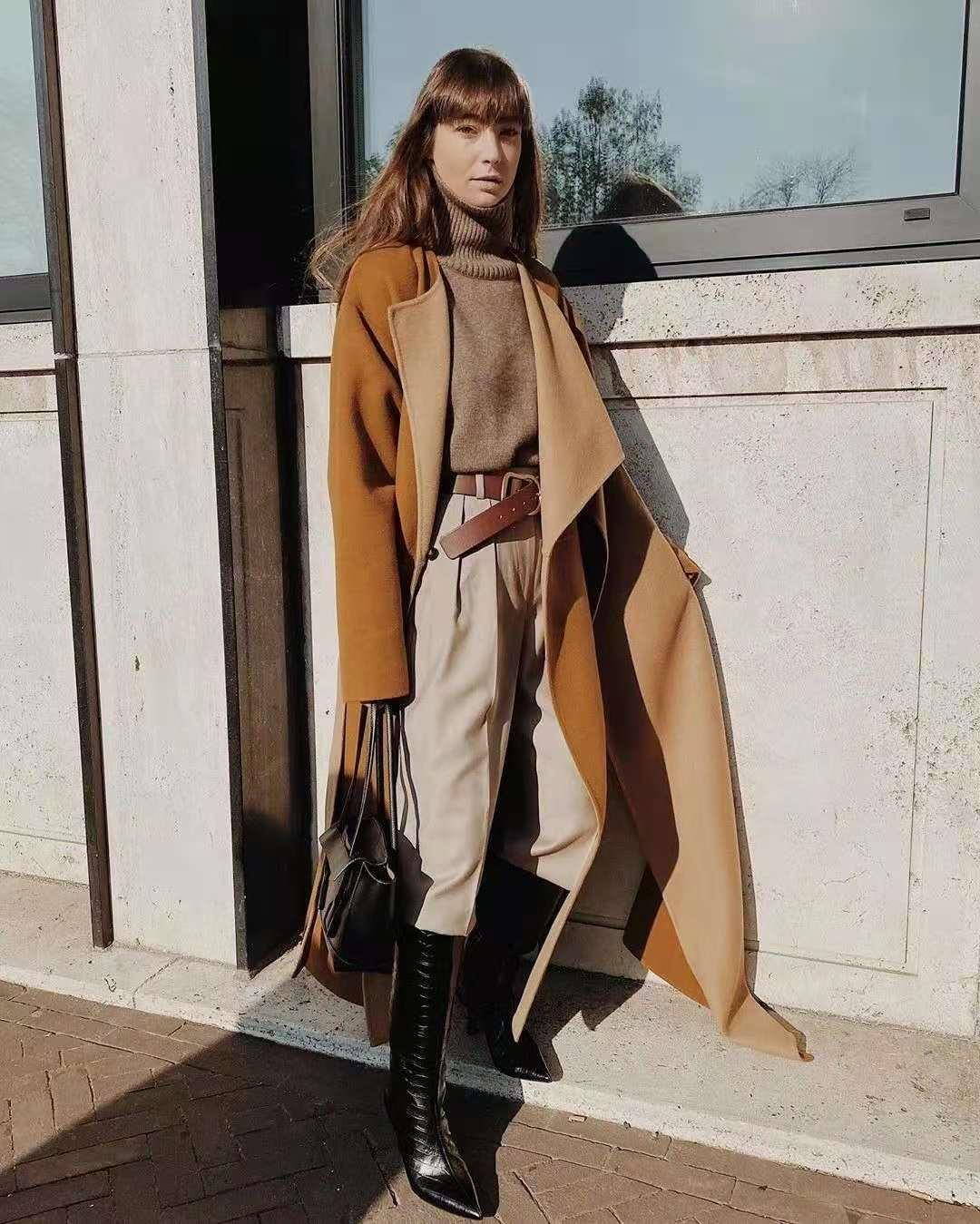 剪裁挺阔、精神有型、版型经典的深色系大衣搭配骑士靴,就是一个十分完美的组合,这个组合很适合日常通勤或是出席一些正式场合穿。建议选择像棕色系的骑士靴,可以起到提亮整体穿搭的效果,显瘦又时髦。
